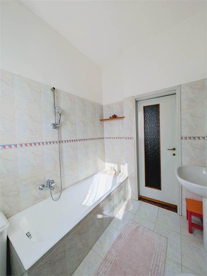 Il bagno ristrutturato con finiture moderne è dotato di vasca.