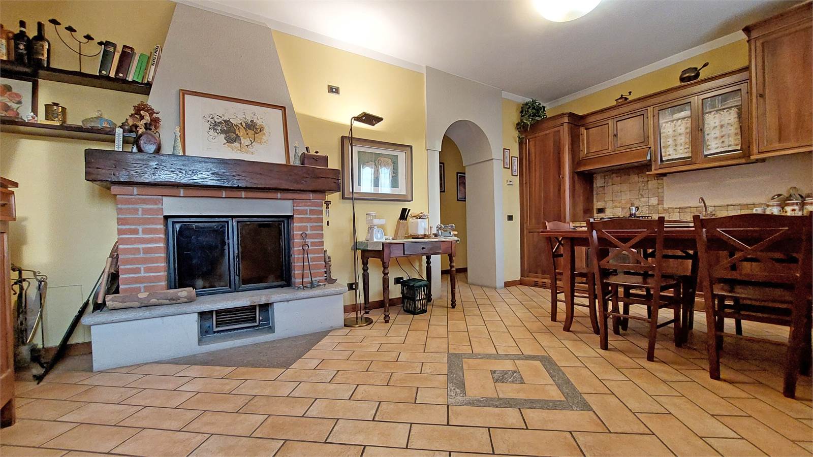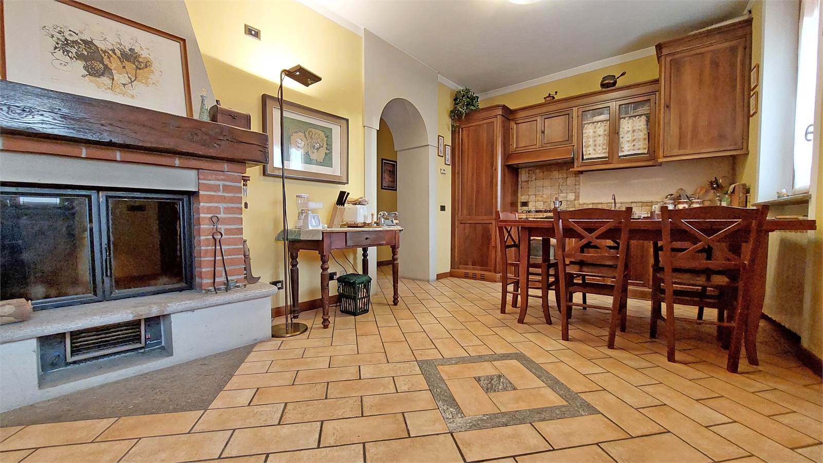 Gli interni, ristrutturati con materiali pregiati, emanano un fascino rustico e autentico, esaltato dalla luminosità dell’esposizione ad ovest. L’ingresso si apre su un’accogliente zona giorno impreziosita da un camino e da una parete cucina lineare. La cucina è una prestigiosa Doralice della Marchi, in pregiato noce nazionale e inserti in ciotoli del Piave: un elemento di grande valore, acquistata a 13.000€ e oggi proposta a un prezzo decisamente superiore sul sito del produttore.