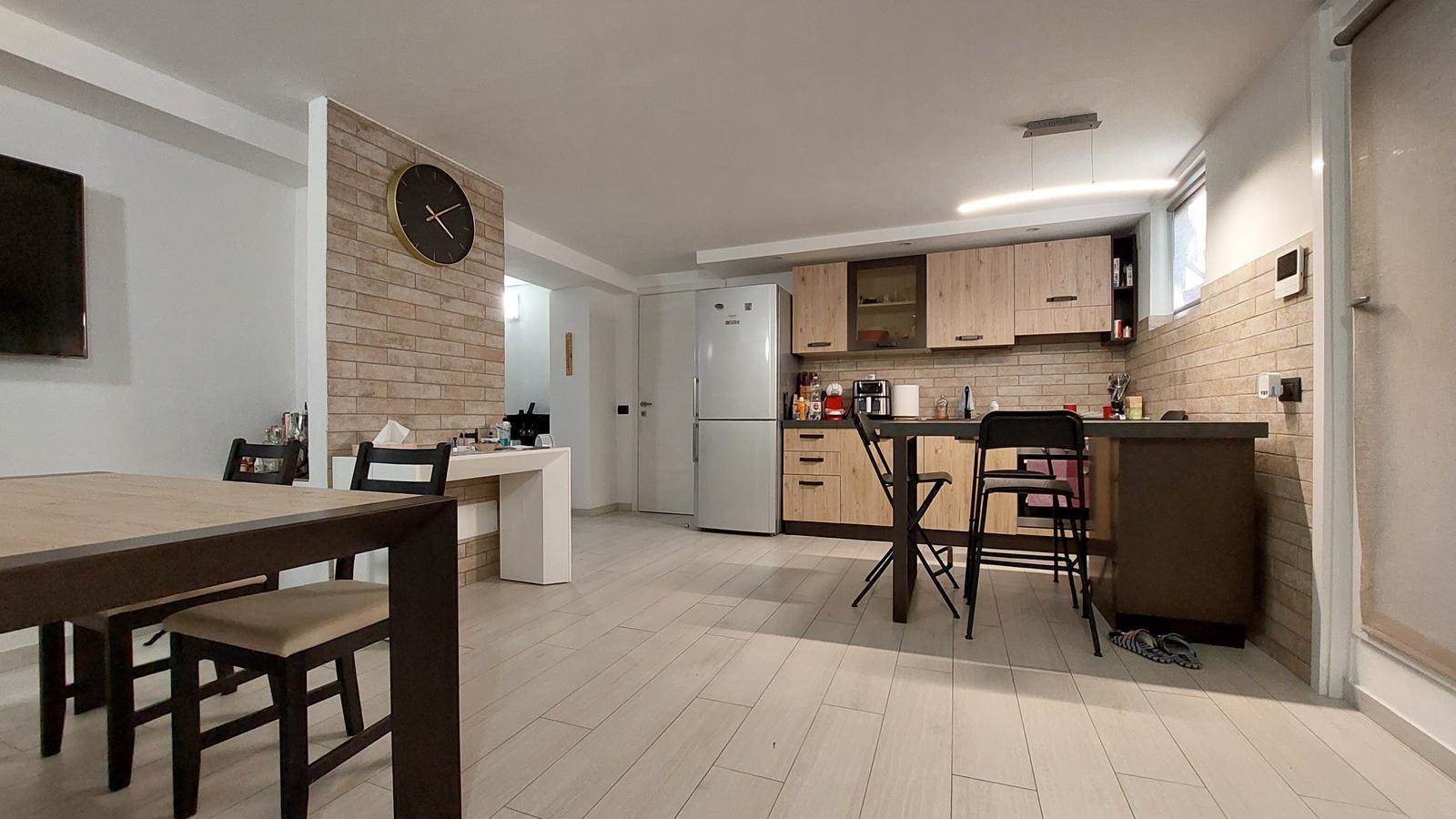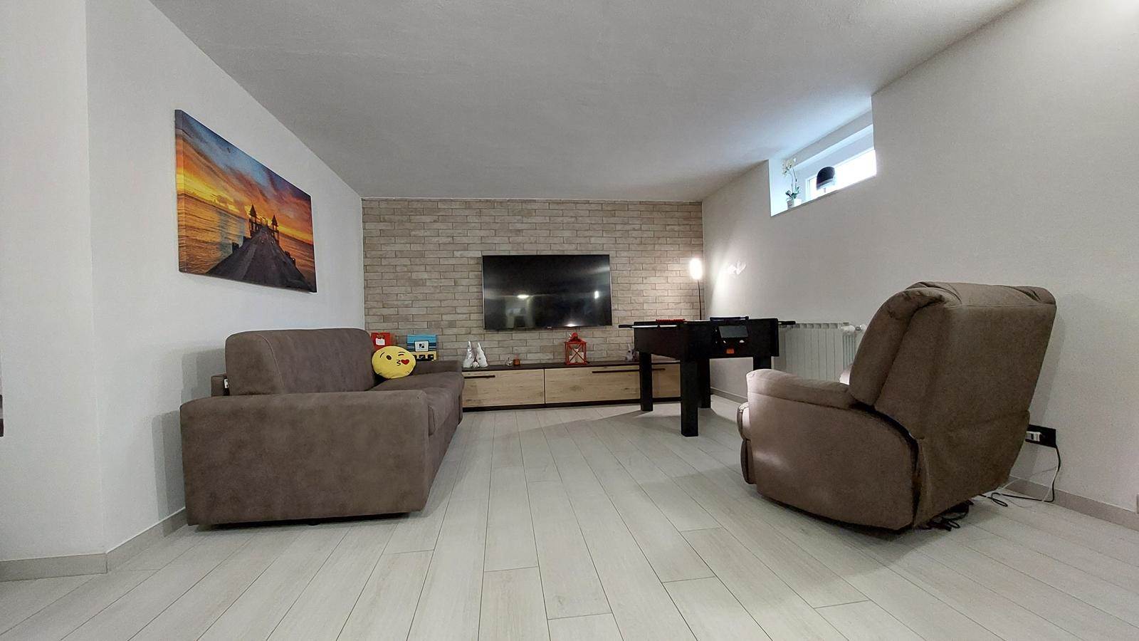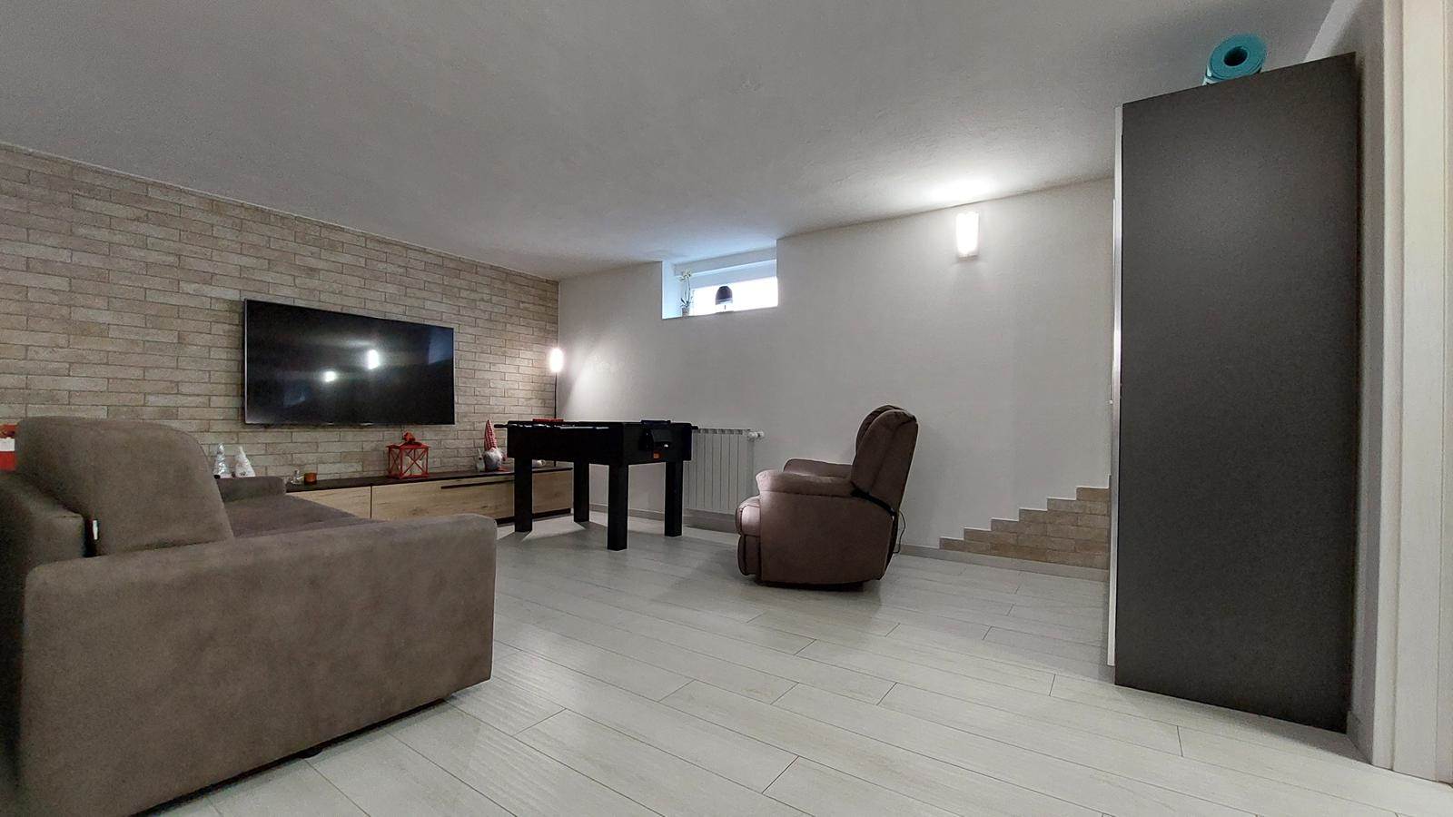 Il piano seminterrato, anch’esso finemente rifinito, è stato adibito ad un accogliente ambiente accessorio composto da soggiorno con cucina a vista, una camera, un bagno/lavanderia e un ampio ripostiglio. Questo spazio versatile è perfetto per ospiti, zona hobby o smart working.
