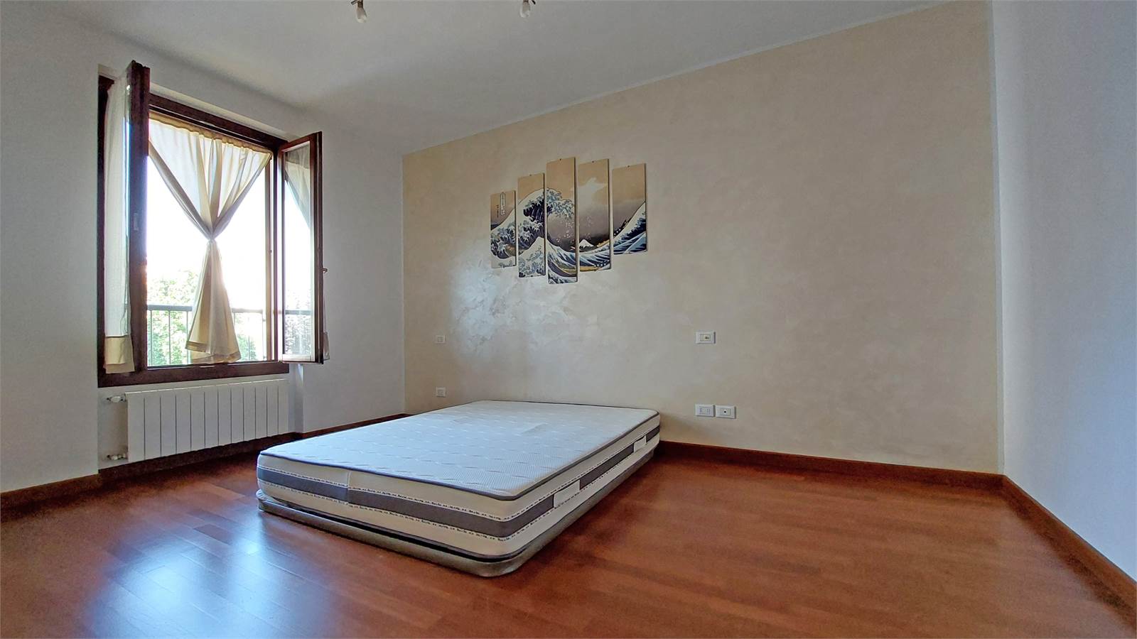 L’abitazione si apre su un luminoso soggiorno con esposizione nord/ovest, collegato a un’ampia cucina abitabile che gode dell’accesso a un grande balcone affacciato sul verde condominiale. La zona notte è composta da due camere matrimoniali spaziose e due bagni finestrati, uno con vasca e l’altro con doccia, garantendo comfort e funzionalità. Completano la proprietà una cantina di generose dimensioni e un box doppio in lunghezza.