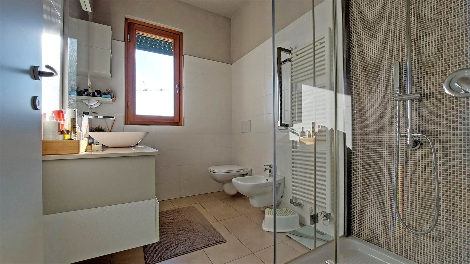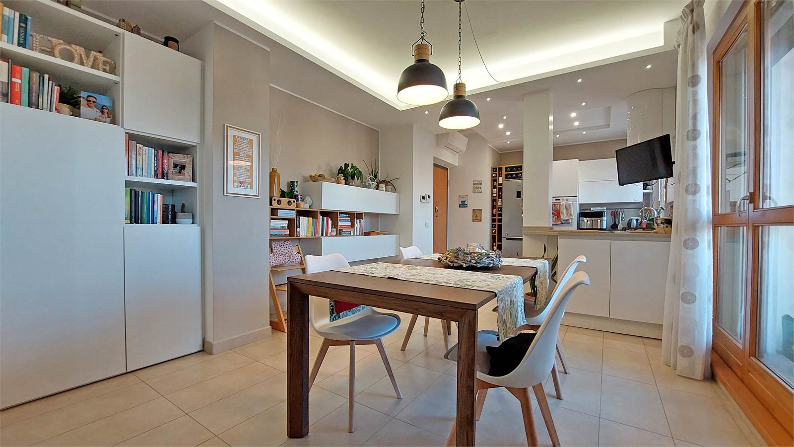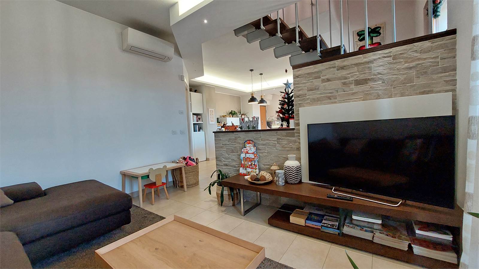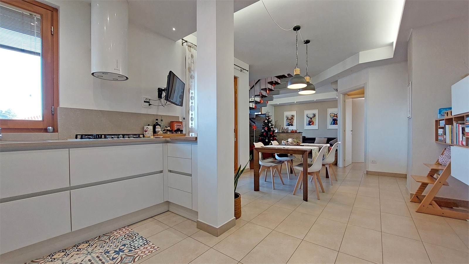 Al piano principale si viene accolti da un elegante open-space che ospita la cucina, il soggiorno e la zona pranzo, con uscita su un terrazzo coperto, sufficientemente ampio da ospitare un tavolo da pranzo, ideale per pranzi e cene all’aperto, che si estende poi in balcone, perfetto per momenti di relax nelle stagioni più miti. Completano il livello un elegante bagno finestrato con ampia doccia, un corridoio con comodo ripostiglio attrezzato con attacchi lavanderia e una comoda scala interna di collegamento al piano superiore.