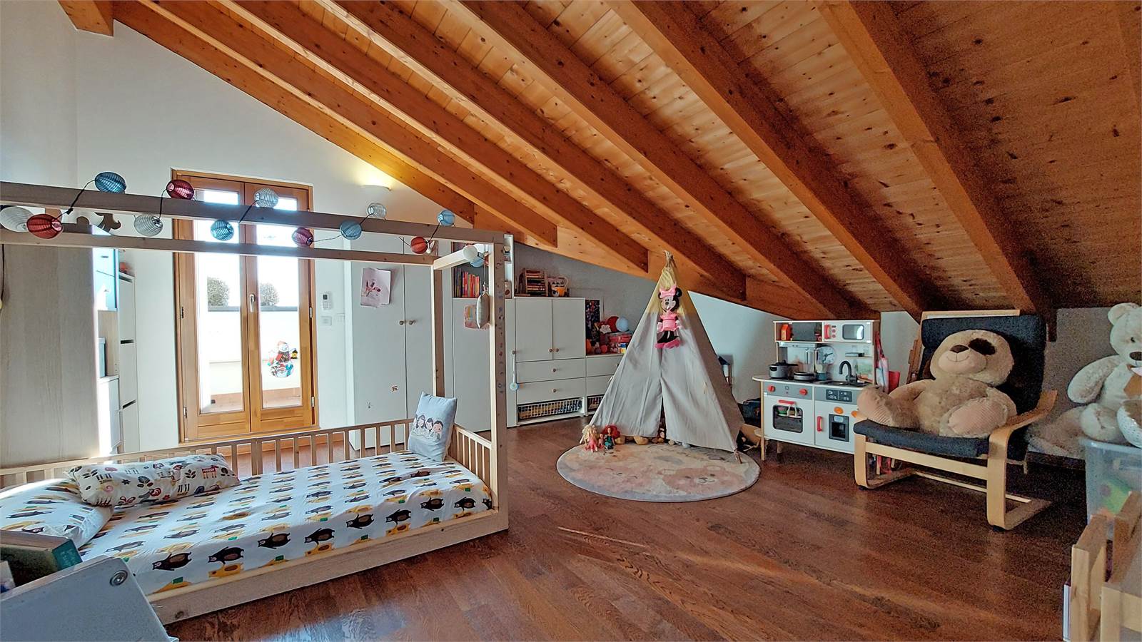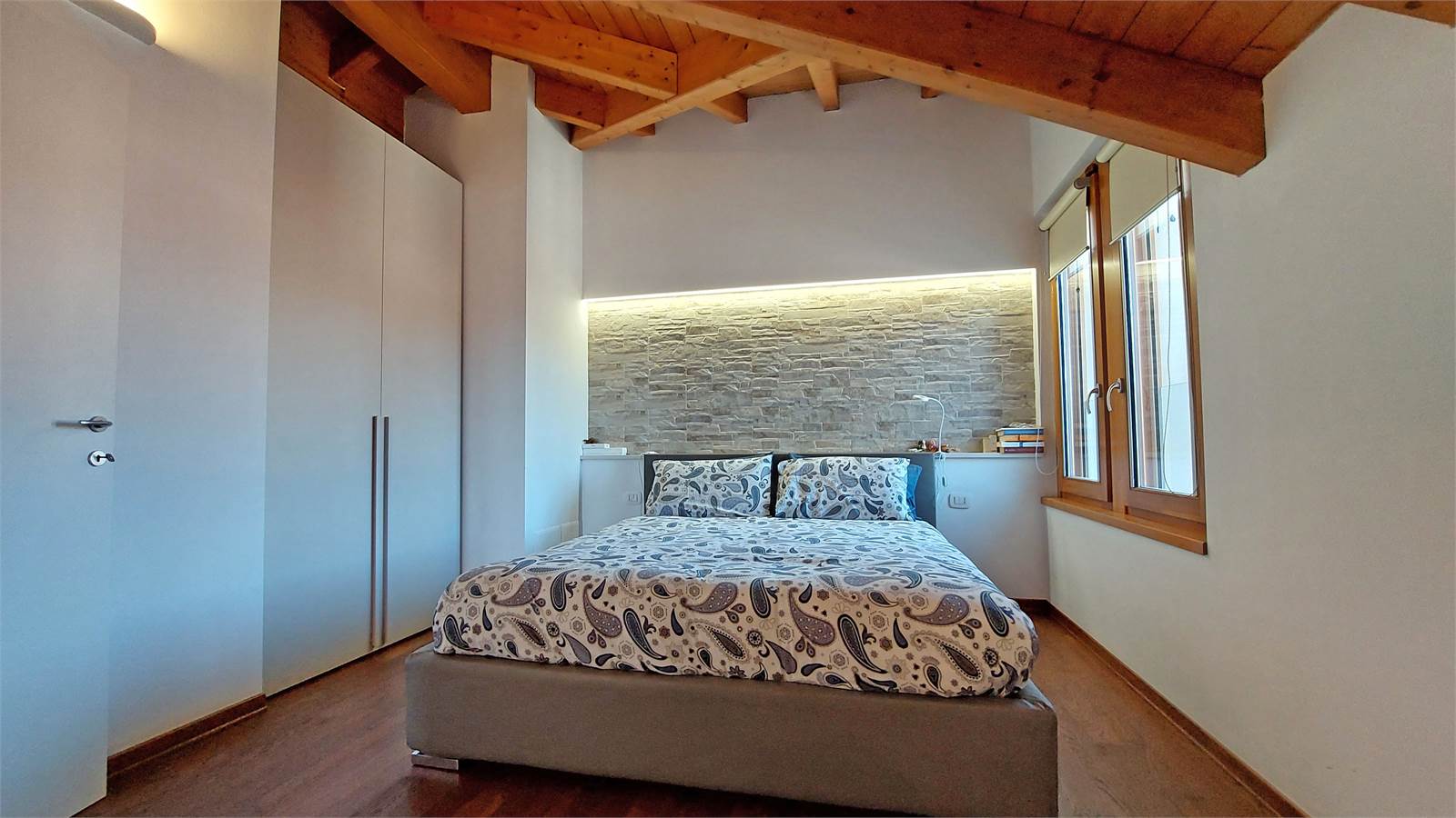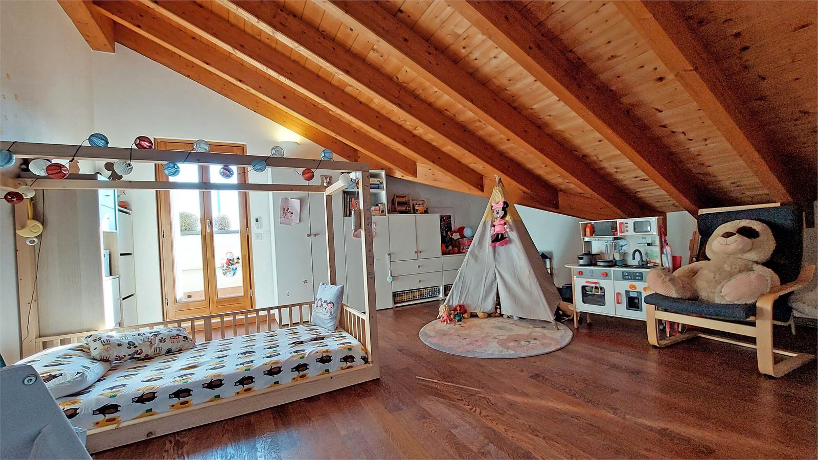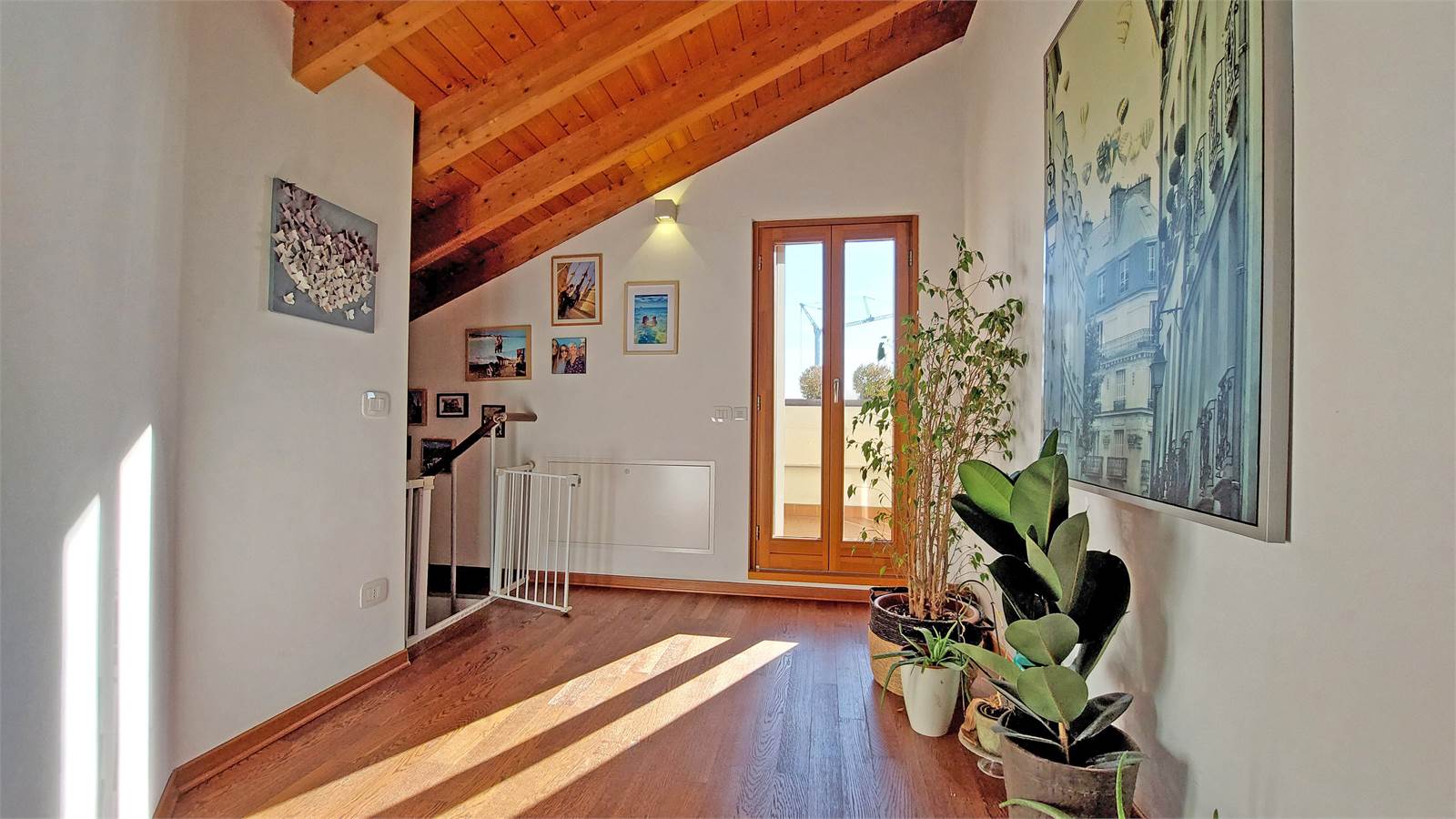 Il piano mansardato ospita un disimpegno, due camere da letto, di cui la matrimoniale impreziosita da una cabina armadio, un terrazzo sul tetto, servizio e un ulteriore ripostiglio, offrendo spazi ben distribuiti e funzionali.